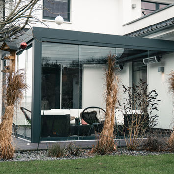 Zudem können Sie dadurch - insbesondere durch Schiebeelemente - einen flexiblen Raum mit Offenheit nach außen schaffen, den Sie jederzeit, je nach Bedarf und Wunsch, öffnen oder schließen können.